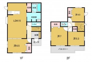 - システムキッチン、浴室乾燥機、複層ガラス、ウォークインクローゼット、モニタ付インターホン、駐車場2台分、駐車場3台分、床下収納、トイレ2箇所